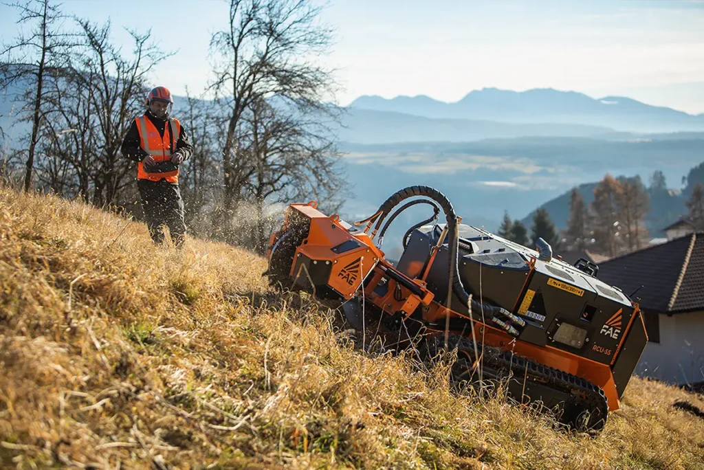The RCU55 is a compact FAE tracked carrier that shreds branches and wood pieces, grass, and small shrubs. It can also cuts stumps when outfitted with an SCL/RCU head. It is equipped with a 56-hp Rehlko (Kohler) engine. The RCU55 can work on steep slopes up to 55°. The heavy-duty undercarriage features a hydraulic variable track system with independent undercarriage frames for maximum stability on steep terrain. The high-profile rubber tracks combined with the undercarriage’s multiple roller system provide unbeatable traction. The dual hydrostatic transmission makes it easier to manage traction and the attachment.