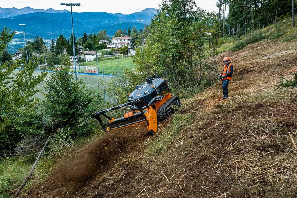 The RCU75 is a compact, powerful FAE tracked carrier that shreds branches and wood pieces, grass, and small shrubs. It can also cuts stumps when outfitted with an SCL/RCU head. It is equipped with a 74-hp Rehlko (Kohler) engine. The RCU75 can work on steep slopes up to 55°. The heavy-duty undercarriage features a hydraulic variable track system with independent undercarriage frames for maximum stability on steep terrain. The high-profile rubber or steel tracks combined with the undercarriage’s multiple roller system provide unbeatable traction. The dual hydrostatic transmission makes it easier to manage traction and the attachment. Equipped with the RPL/SSL-45 road planer, the RCU75 can be used to mill asphalt and concrete up to 17 cm deep.