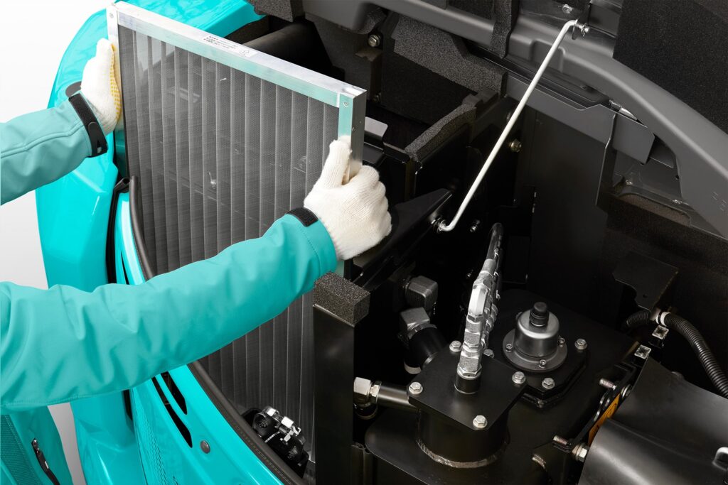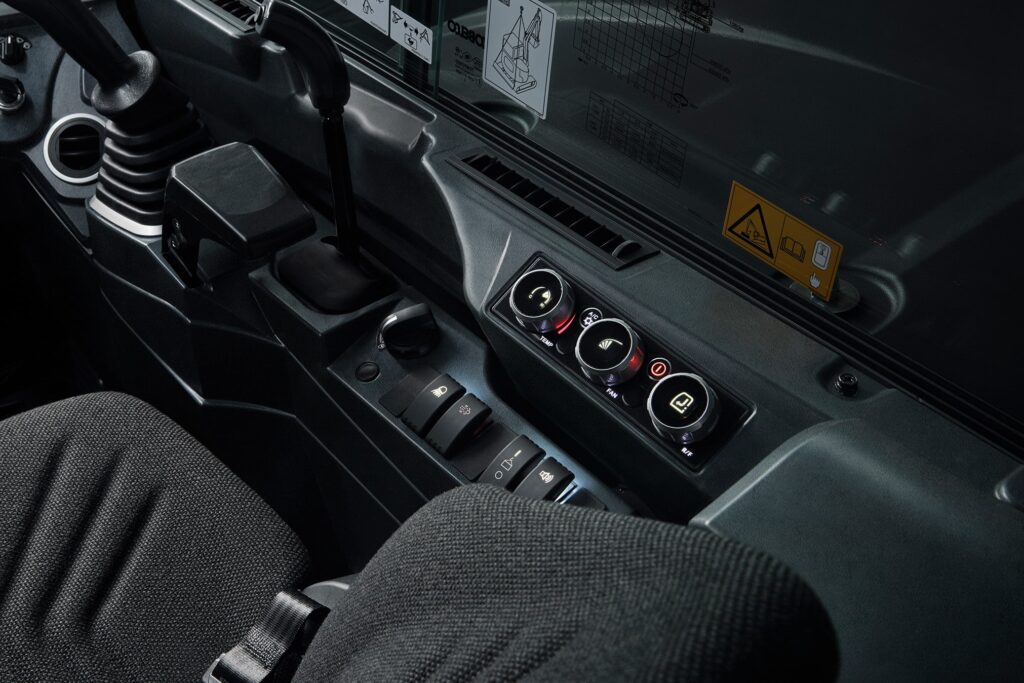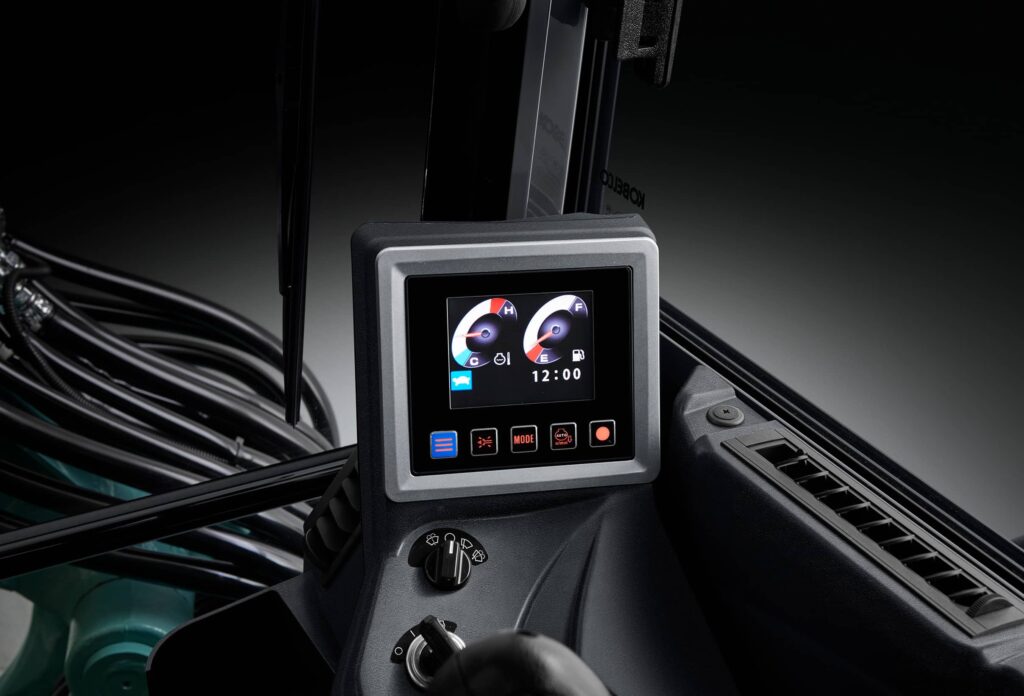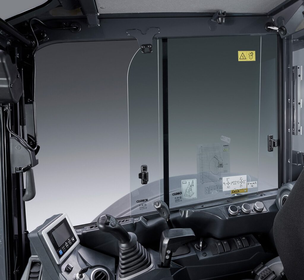 The SK55SRX features a compact tail swing for operation in restricted spaces, such as on urban or residential jobsites, for a smaller working footprint. However, a larger boom and arm are provided as standard equipment for a wide working range. The iNDr system on the SK55SRX features air intake at the front of the machine and air exhaust underneath. It functions in the same way as the iNDr System on the SR series machines. The stainless-steel filter is extremely effective against dust, with 30-mesh wave-type screen that removes tiny dust particles from the intake air and delivers amazingly quiet operation. The highly airtight engine compartment and the offset duct contribute to noise reduction. The next generation SK55SRX delivers increased performance and productivity and follow Kobelco’s Performance X Design concept for enhanced design and operator comfort. This model also adopts a square ROPS cab or canopy complete with wide foot space, and added windows for a clear vision of the worksite. The high-strength canopy meets ROPS and FOPS standards for greater operator safety.